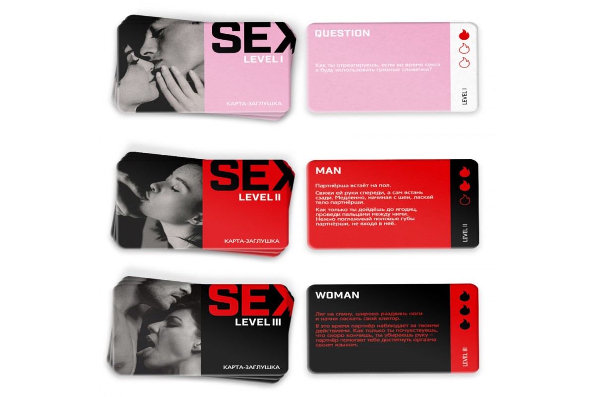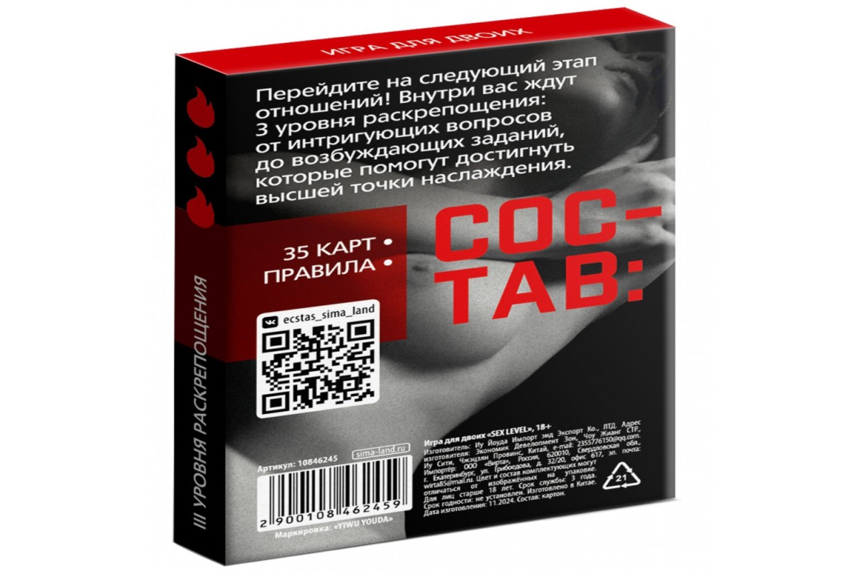 Эта игра создана для тех, кто готов выйти за рамки привычного и открыть новые грани отношений. Вас ждут интригующие вопросы и возбуждающие задания, которые помогут достигнуть высшей точки наслаждения!Состав игры:30 двухсторонних карт (по 10 карт каждого уровня)3 карты-заглушки2 карты «NEXT LEVEL»Ход игры:Разделите карты на 3 колоды по уровню сложностиЗамешайте в колоду 1-го и 2-го уровней карту «NEXT LEVEL»Поместите поверх каждой колоды карту-заглушкуОпределите, кто из вас ходит первым и приступайте к игре!Перейдите на следующий уровень ваших отношений вместе с «SEX LEVEL»!Внутри вы найдёте 35 карточек.Упаковка: коробка