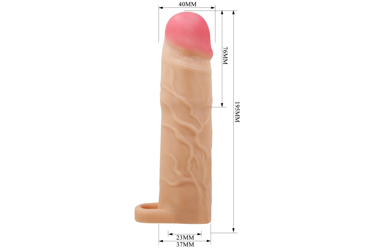 Размеры и объем петли позволят не только надежно удерживать насадку, но и обеспечат чувственную стимуляцию, а также сделают половой акт продолжительнее. Воплотите в жизнь Ваши желания и фантазии!Удлиняет член на 7,6 см.Размеры: общая длина 19,5 см, длина внутреннего канала 11,9 см, внешний диаметр 3,7-4 см, внутренний диаметр в не растянутом состоянии 2,3 см