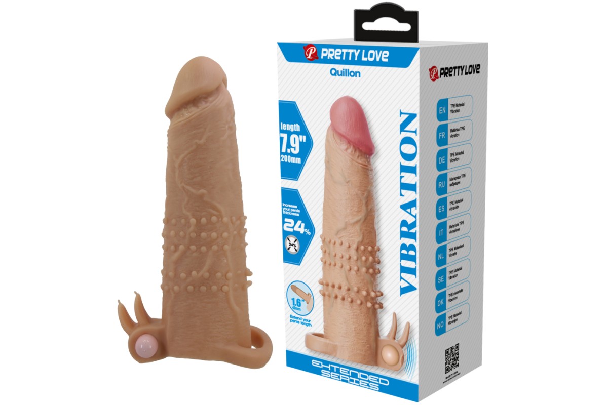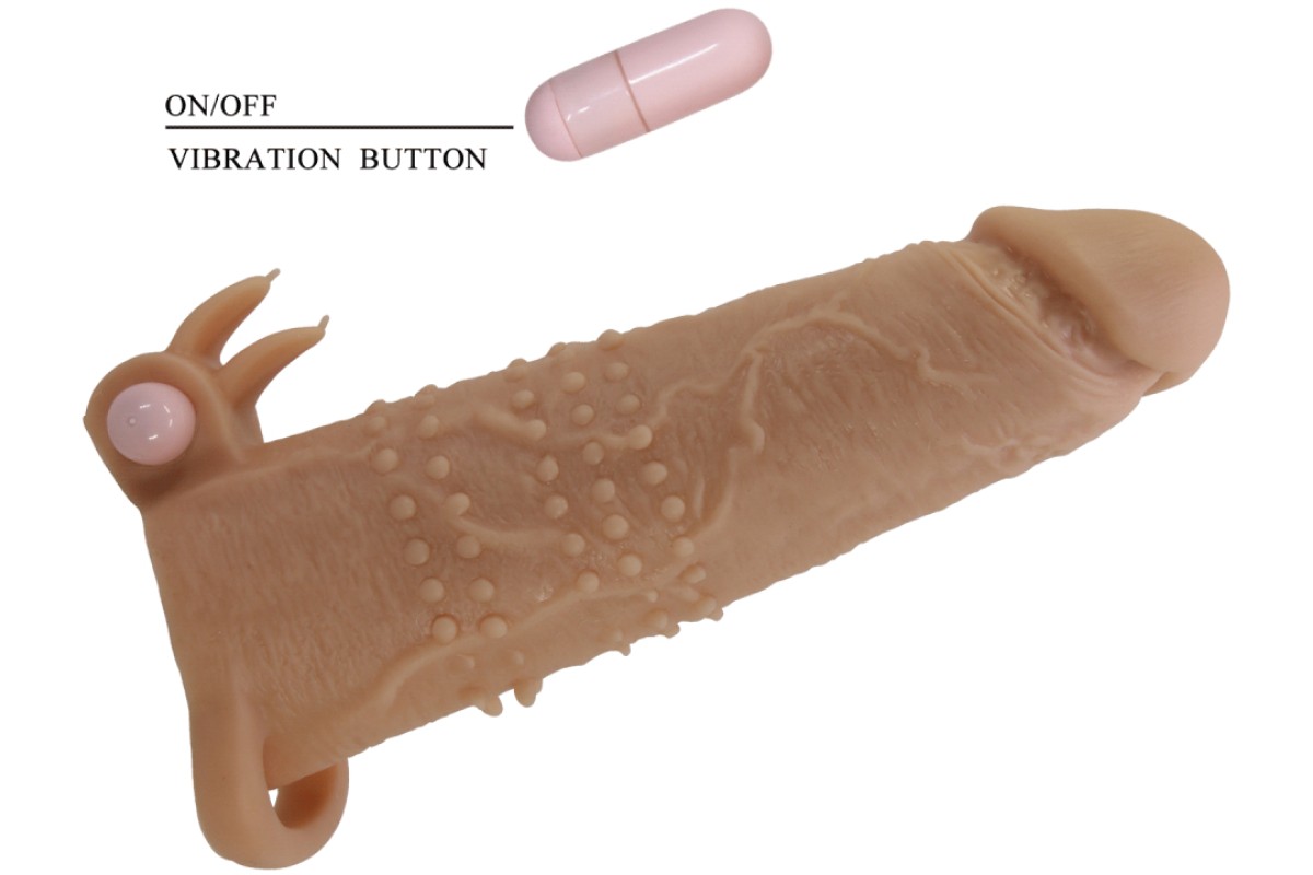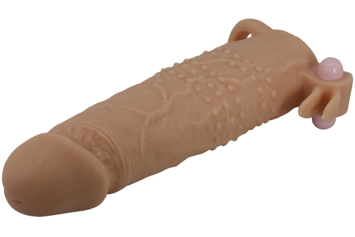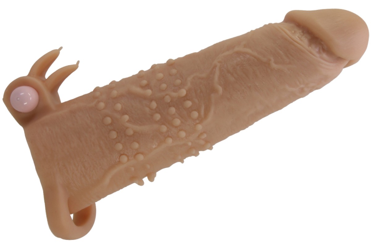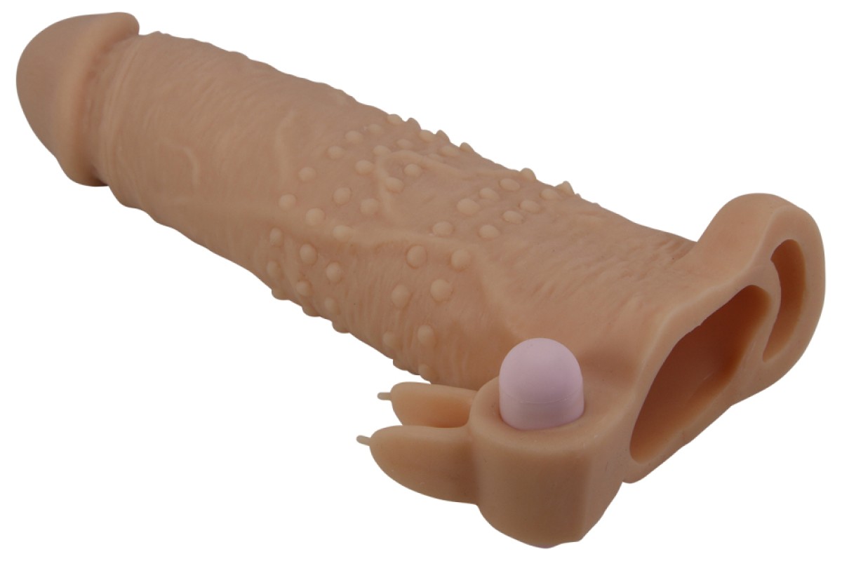 Увеличивающая вибронасадка с клиторальным стимулятором и петлей под мошонку телесная Quillon + 6 см