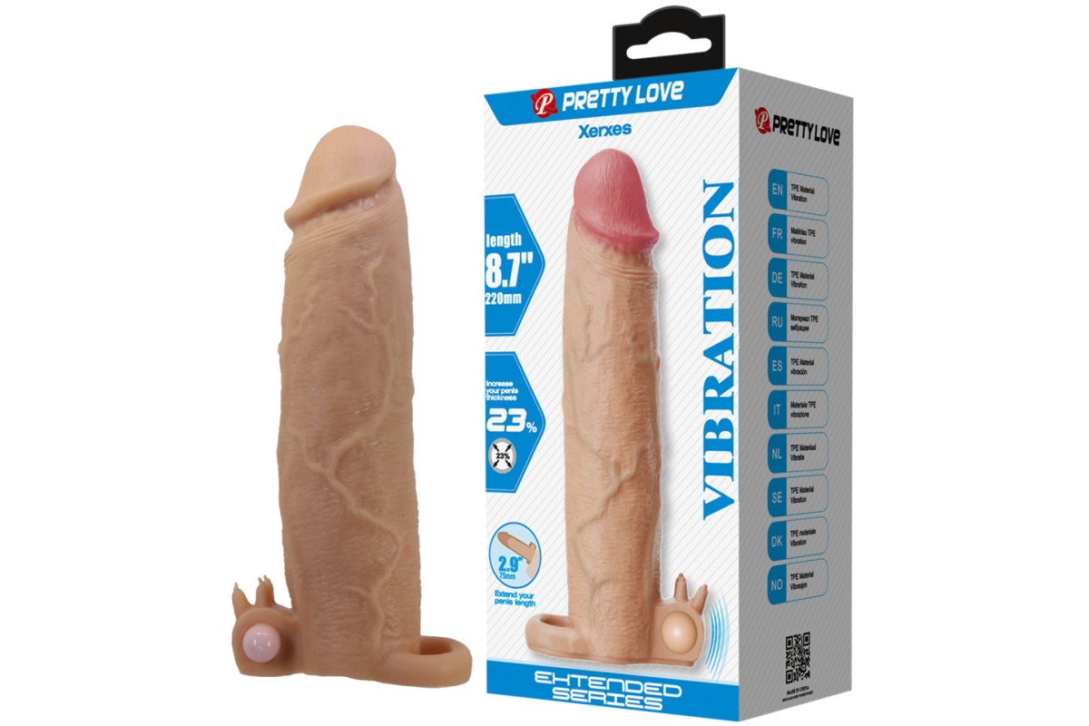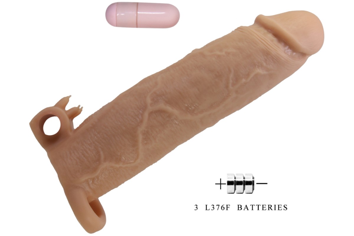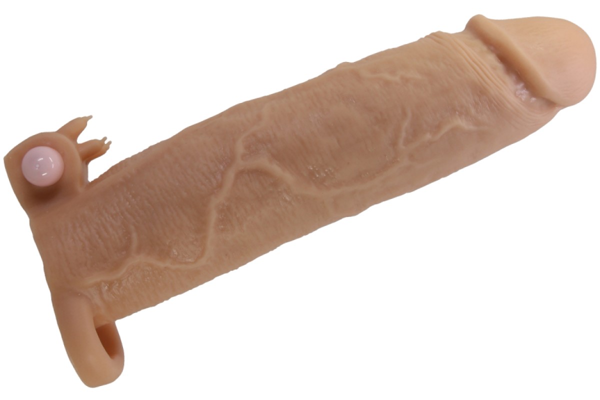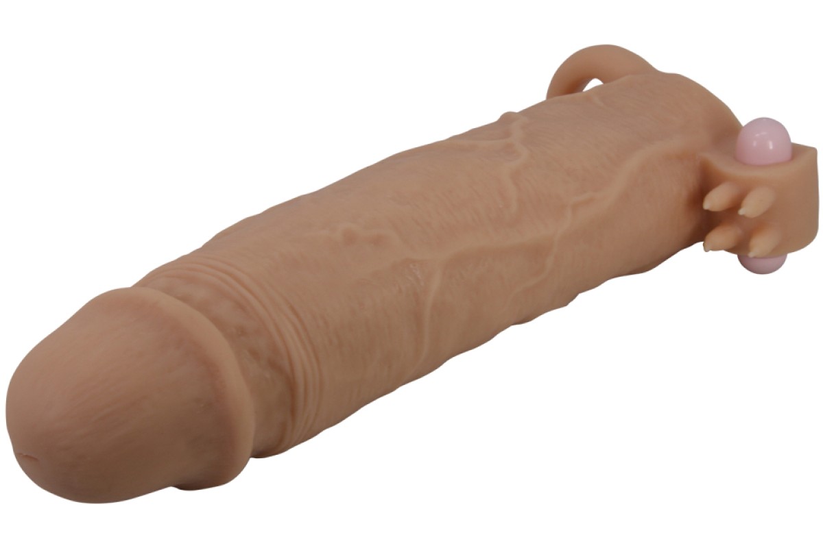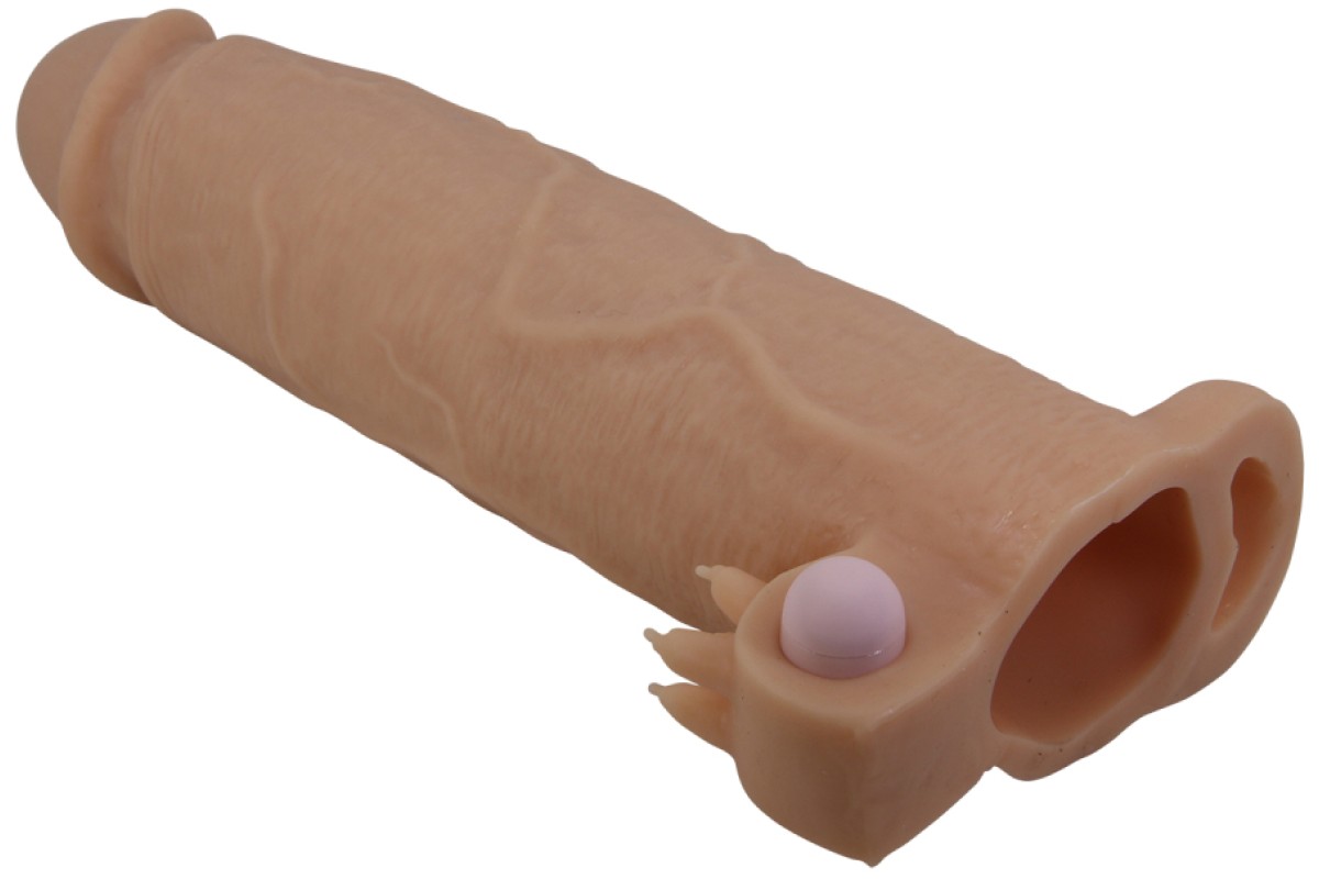 Увеличивающая вибронасадка с клиторальным стимулятором и петлей под мошонку телесная Xerxes + 7,5 см
